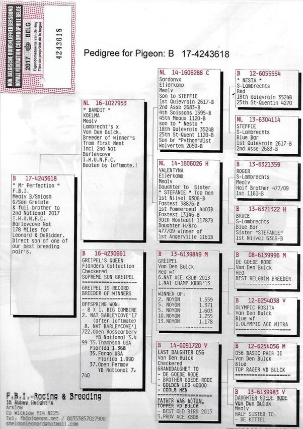 G/Sire to: "Sheldon" and "Haaland" Top Champion Winners and now Top Breeders at Proudstown TT Lofts.